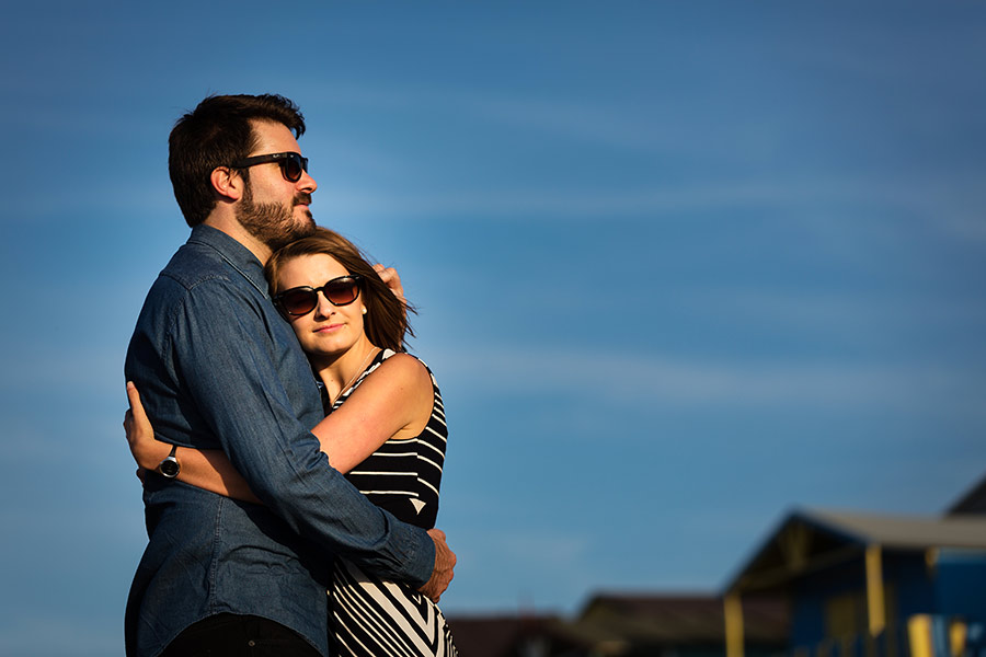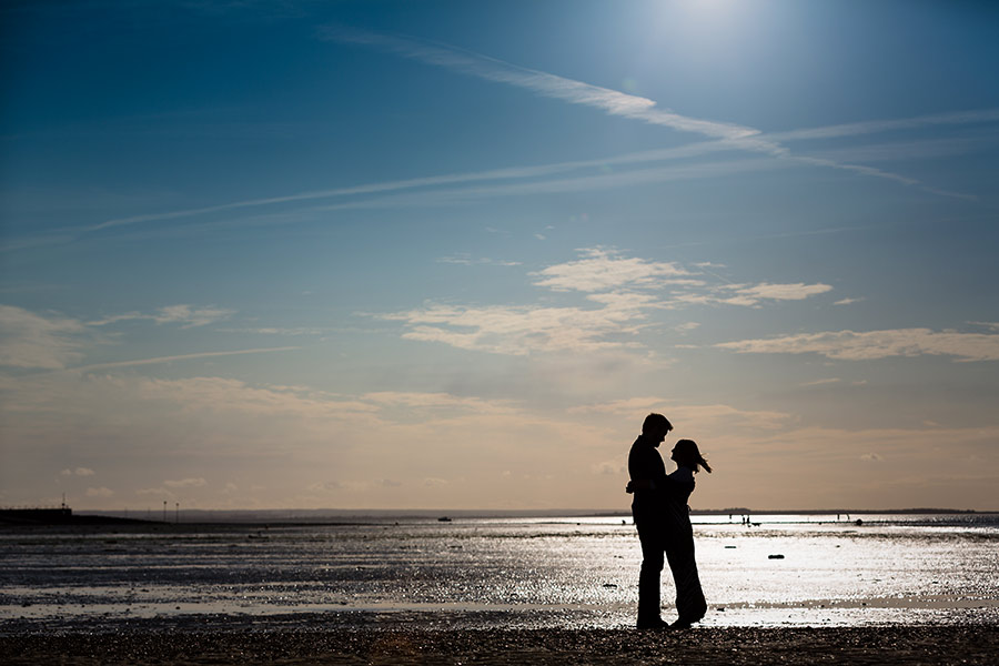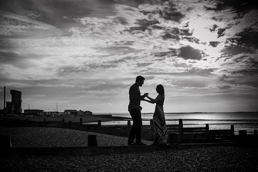 Tom and Claire soon relaxed into the shoot, even though it was pretty busy down at the coast with folk wanting to make the most of the good weather and no doubt were waiting for a sunset. The light was just beautiful that evening and although initially sunglasses were required, the light gave options for back lighting and creating some interesting silhouettes. It was a little windy but thankfully it was blowing in the right direction for the light. Tom and Claire were such good company and needed little direction, particularly once they fully relaxed into their Whitstable engagement shoot!