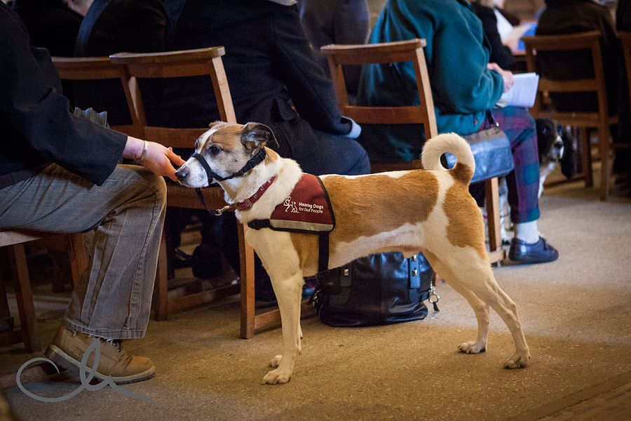 I was approached by Hearing Dogs for Deaf People to cover celebrations for 30 years of Hearing Dogs. I was delighted to accept the commission for this fabulous organisation. The service was held in the crypt of Canterbury Cathedral on the 23rd January, which happens to be the eve of St Francis de Sale’s Day – The Patron of Deaf People. This event was actually a joint celebration because Maggie, who is an assistant guide at the Cathedral, sadly lost her Hearing Dog Clay in July 2012 and so the service was also to remember Clay and celebrate his life. The service was lead by Canon Clare Edwards and guests included The Lord Mayor of Canterbury and the Sheriff of Canterbury, the Chair of Trustees and CEO of Hearing Dogs. Tea and cake were served in the Cathedral Lodge where a book of remembrance was held for Clay for all the people that knew and loved him.